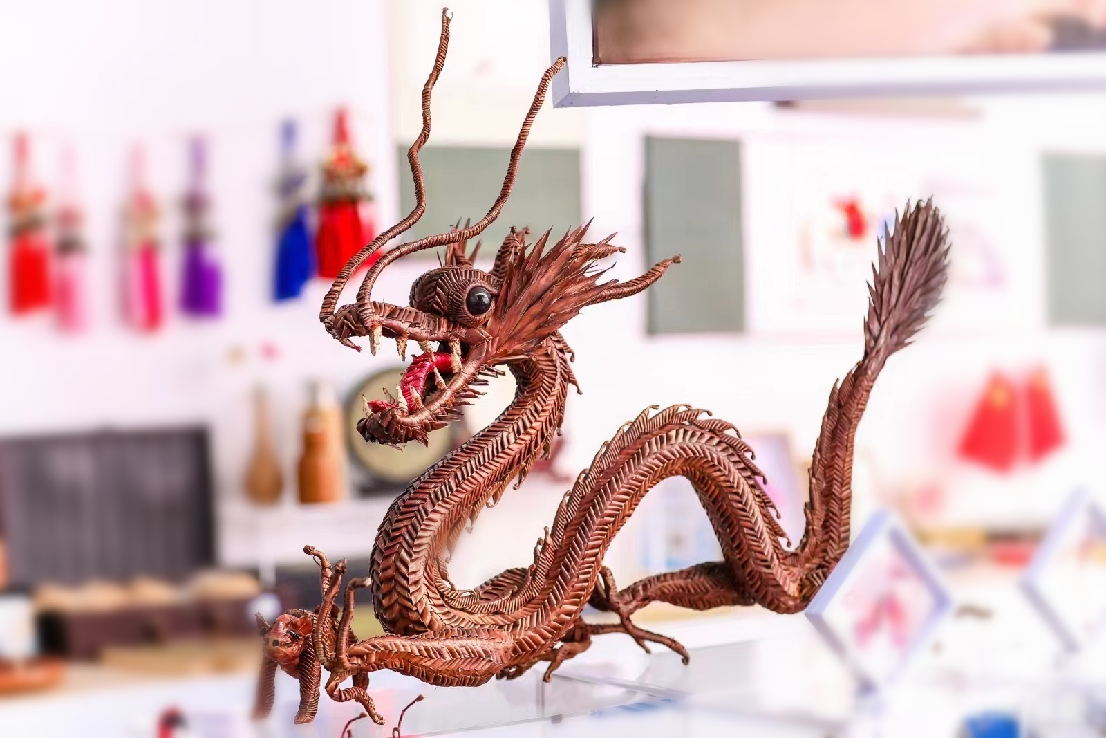 黃強從2004年開始學習羌族草編技藝,在繼承傳統(tǒng)技法的基礎上進行工藝創(chuàng)新,結合人們的生活需求,研發(fā)草編草鞋以及生活飾品、擺件等,草編龍就是其中之一。近年來,他與團隊研發(fā)出不同規(guī)格、不同形態(tài)的草編中國龍,并多次帶出國門展示、展銷,受到世界各地友人的喜愛。