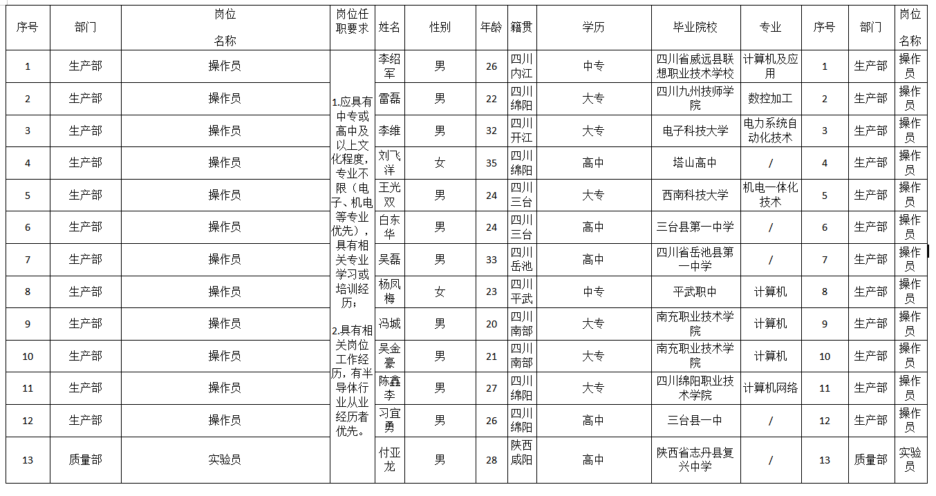根據(jù)四川啟賽微電子公司發(fā)布的招聘公告及招聘相關(guān)規(guī)定,從2024年1月1日至2024年2月29日,經(jīng)面試、考察、體檢等程序,擬錄用以下13名同志到操作職崗位工作,現(xiàn)予以公示,具體情況如下: