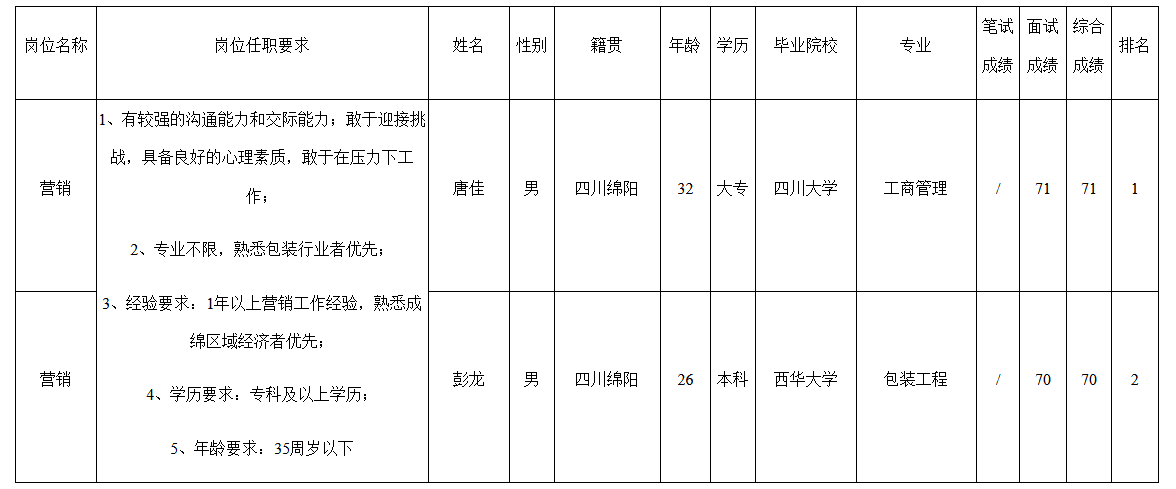 根據(jù)四川長虹包裝印務(wù)有限公司發(fā)布的招聘公告及招聘相關(guān)規(guī)定,經(jīng)筆試、面試等程序,現(xiàn)將筆試(面試)成績予以公示。