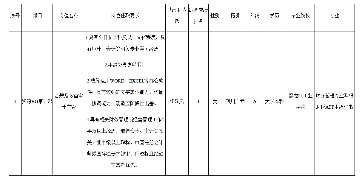 根據(jù)四川長虹置業(yè)有限公司2024年1月2日發(fā)布的招聘公告及招聘相關(guān)規(guī)定,經(jīng)資源BG審計分部初試、集團審計部復(fù)試和考察等程序,擬錄用任顯鳳同志到資源BG審計分部工作,現(xiàn)予以公示,具體情況如下:
