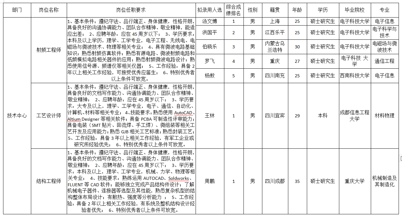 根據(jù)成都九洲迪飛科技有限責任公司發(fā)布的招聘公告及招聘相關(guān)規(guī)定,經(jīng)筆試、面試、考察、體檢等程序,擬錄用湯文博等同志到成都九洲迪飛科技有限責任公司工作,現(xiàn)予以公示,具體情況如下: