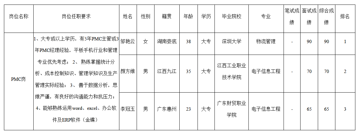 根據(jù)深圳市九洲智和科技有限公司發(fā)布的招聘公告及招聘相關規(guī)定,經(jīng)筆試、面試等程序,現(xiàn)將筆試(面試)成績予以公示。
