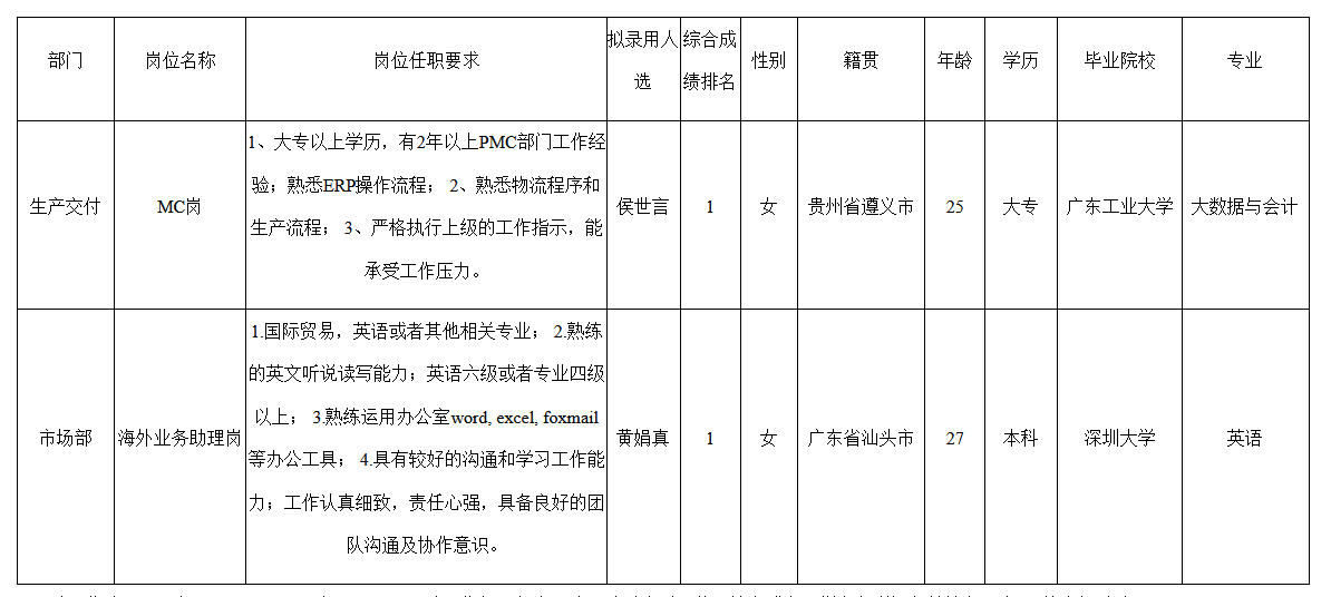 根據(jù)深圳市九洲智和科技有限公司發(fā)布的招聘公告及招聘相關(guān)規(guī)定,經(jīng)筆試、面試、考察、體檢等程序,擬錄用黃娟真,侯世言同志到深圳市九洲智和科技有限公司工作,現(xiàn)予以公示,具體情況如下: