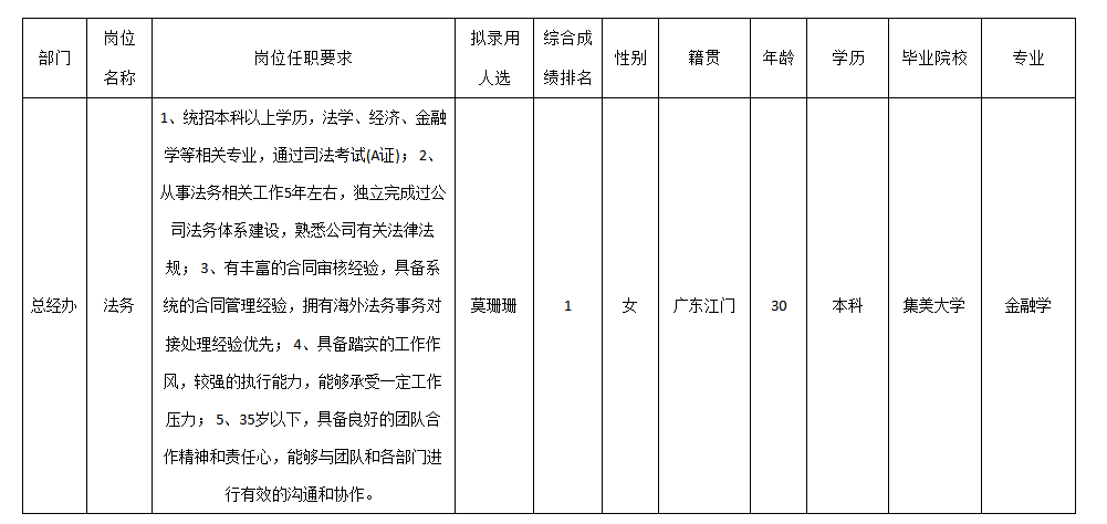 根據(jù)久和新科技(深圳)有限公司發(fā)布的招聘公告及招聘相關(guān)規(guī)定,經(jīng)筆試、面試、考察、體檢等程序,擬錄用莫珊珊同志到久和新科技(深圳)有限公司工作,現(xiàn)予以公示,具體情況如下: