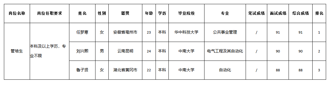 根據(jù)四川波鴻實(shí)業(yè)有限公司發(fā)布的招聘公告及招聘相關(guān)規(guī)定,經(jīng)面試后,現(xiàn)將威斯卡特工業(yè)(中國(guó))有限公司管培生成績(jī)予以公示。