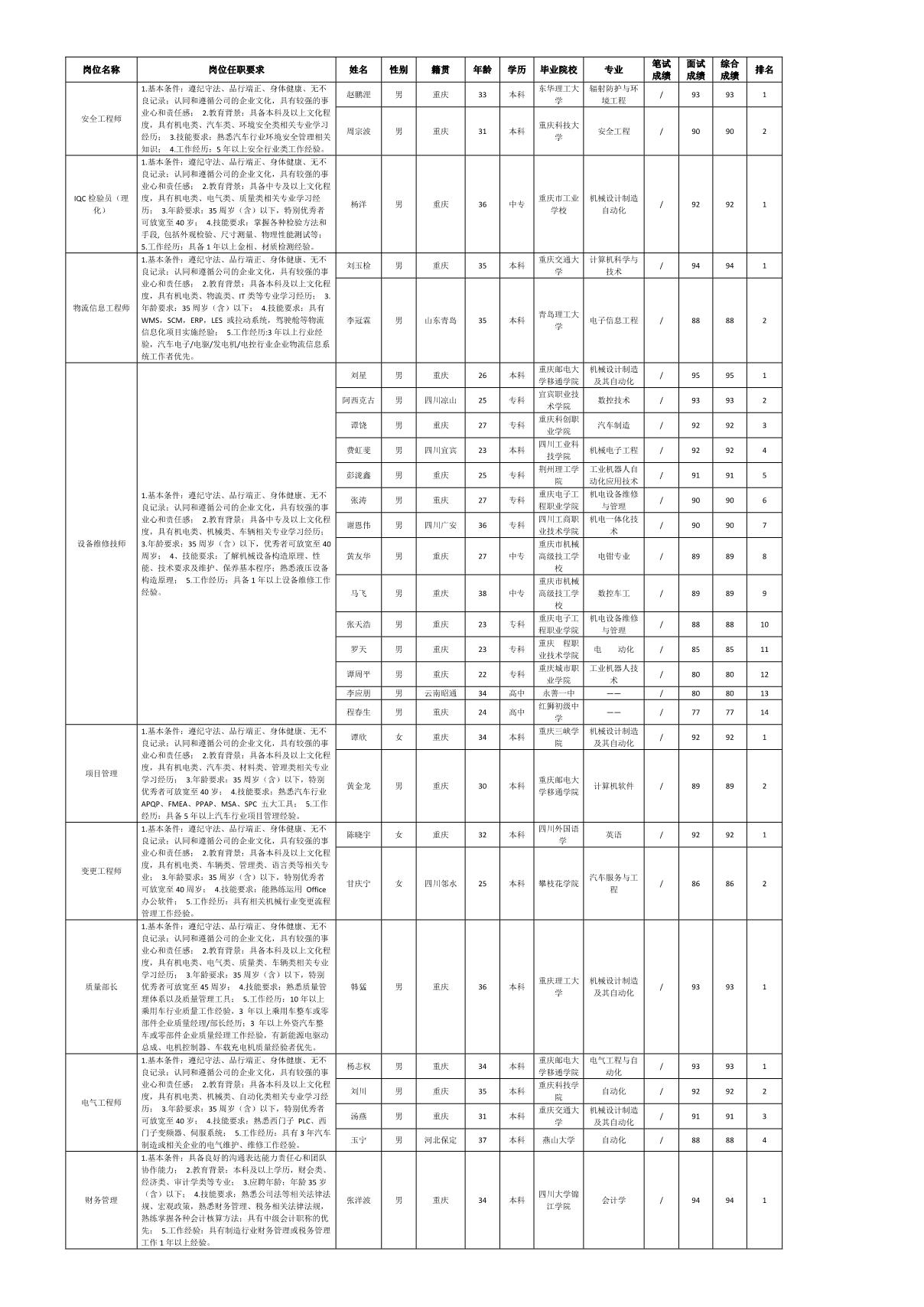 根據重慶九州智造科技有限公司發(fā)布的招聘公告及招聘相關規(guī)定,經筆試、面試等程序,現(xiàn)將筆試(面試)成績予以公示。