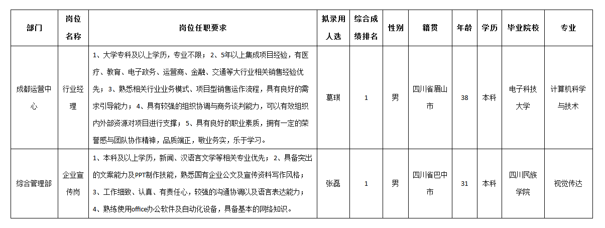 根據(jù)四川科瑞軟件有限責(zé)任公司發(fā)布的招聘公告及招聘相關(guān)規(guī)定,經(jīng)筆試、面試、考察、體檢等程序,擬錄用張磊,葛琪同志到四川科瑞軟件有限責(zé)任公司工作,現(xiàn)予以公示,具體情況如下: