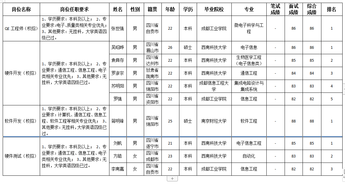 根據(jù)四川九州電子科技股份有限公司發(fā)布的招聘公告及招聘相關(guān)規(guī)定,經(jīng)筆試、面試等程序,現(xiàn)將筆試(面試)成績(jī)予以公示。