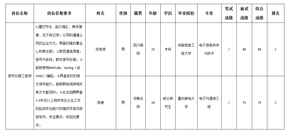 根據(jù)四川九強(qiáng)通信科技有限公司發(fā)布的招聘公告及招聘相關(guān)規(guī)定,經(jīng)筆試、面試等程序,現(xiàn)將筆試(面試)成績予以公示。