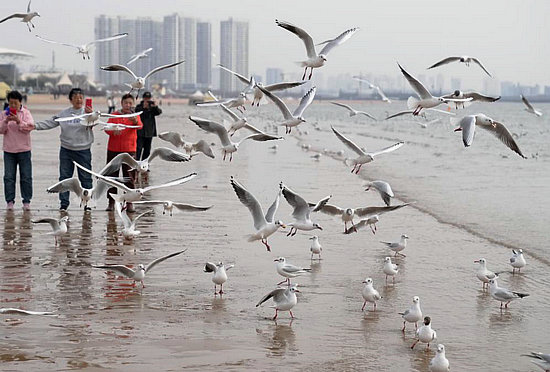 春日和暖,大批海鷗在河北省秦皇島市金夢海灣浴場飛舞、覓食,吸引游客前來觀賞。
