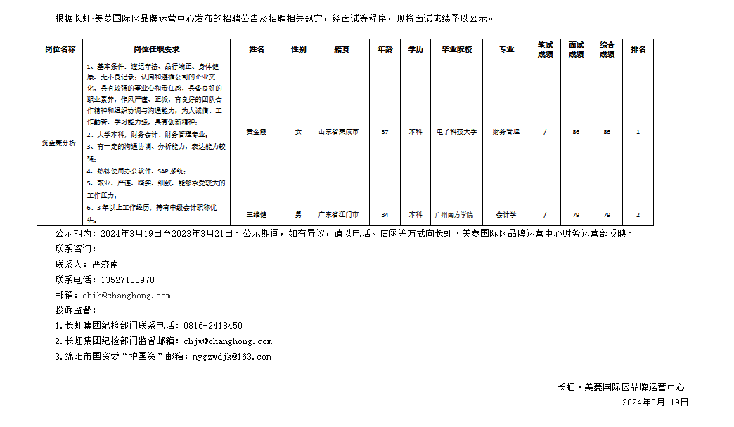 長虹·美菱國際區(qū)品牌運(yùn)營中心關(guān)于招聘資金兼分析崗成績(jī)的公示