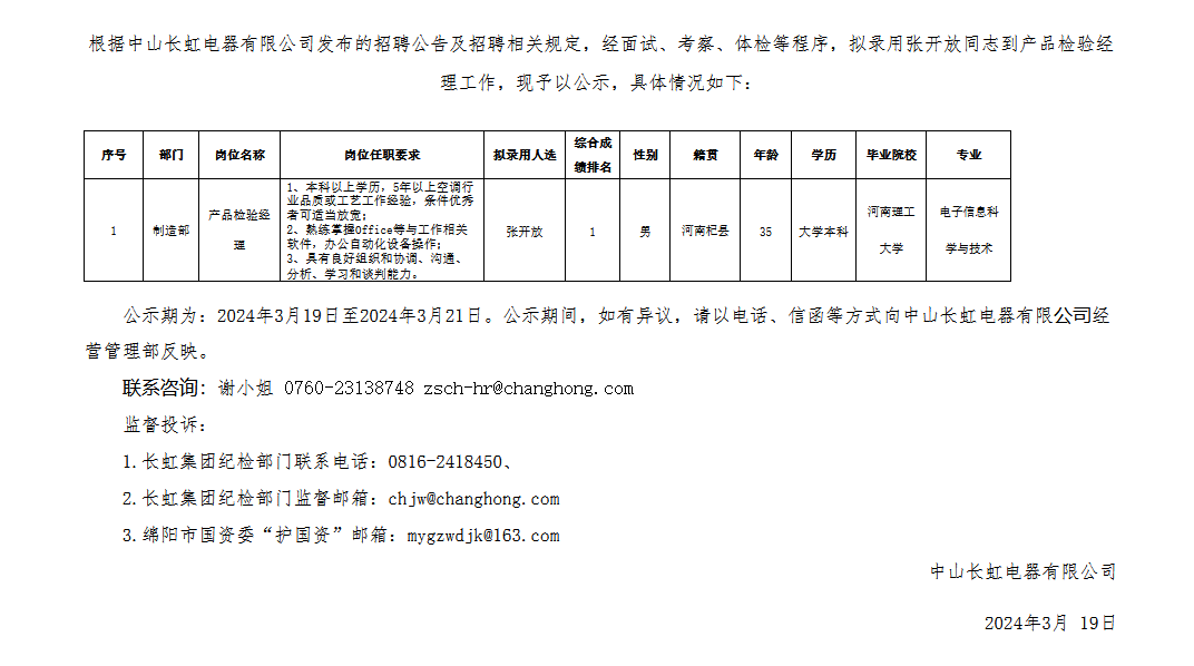 中山長虹電器有限公司關(guān)于招聘產(chǎn)品檢驗經(jīng)理擬錄用人員的公示