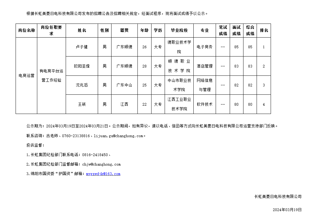長(zhǎng)虹美菱日電科技有限公司關(guān)于招聘電商運(yùn)營(yíng)崗成績(jī)的公示