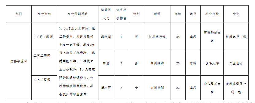 根據(jù)四川華豐科技股份公司發(fā)布的招聘公告及招聘相關(guān)規(guī)定,經(jīng)筆試、面試、考察、體檢等程序,擬錄用邱祖潤等同志到四川華豐科技股份有限公司工作,現(xiàn)予以公示,具體情況如下: