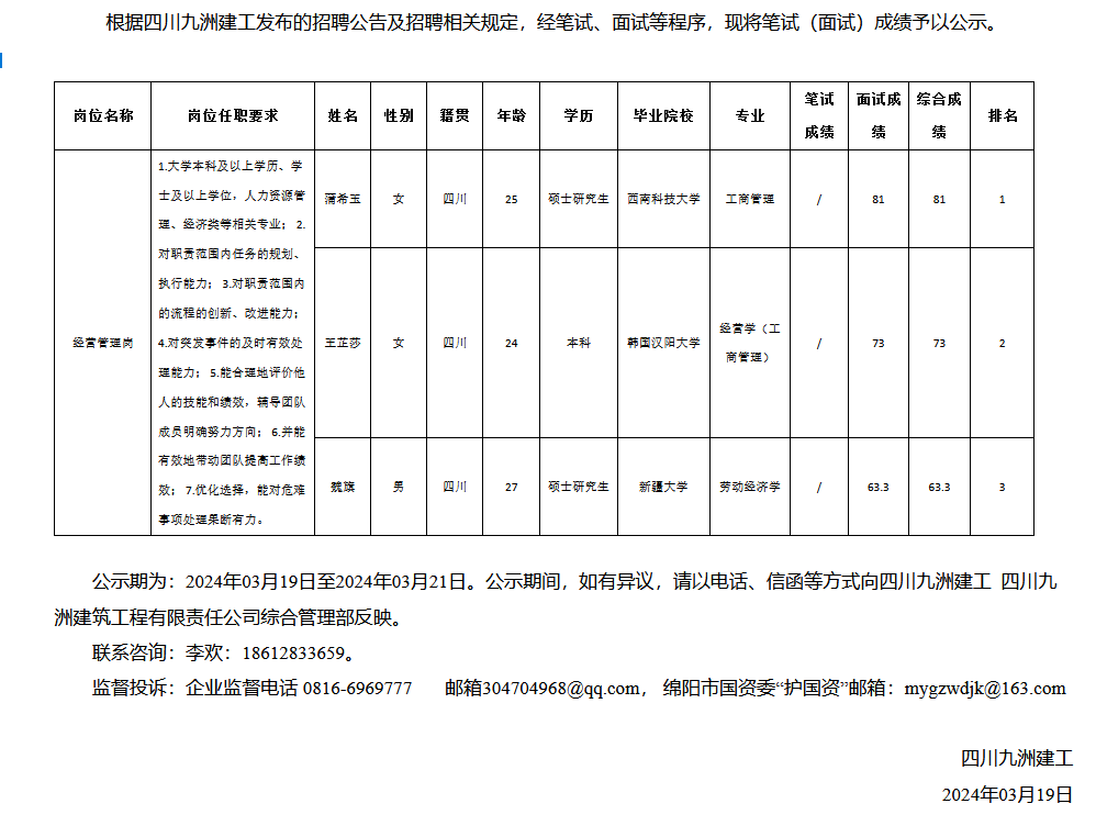 四川九洲建工關(guān)于招聘經(jīng)營(yíng)管理崗成績(jī)的公示