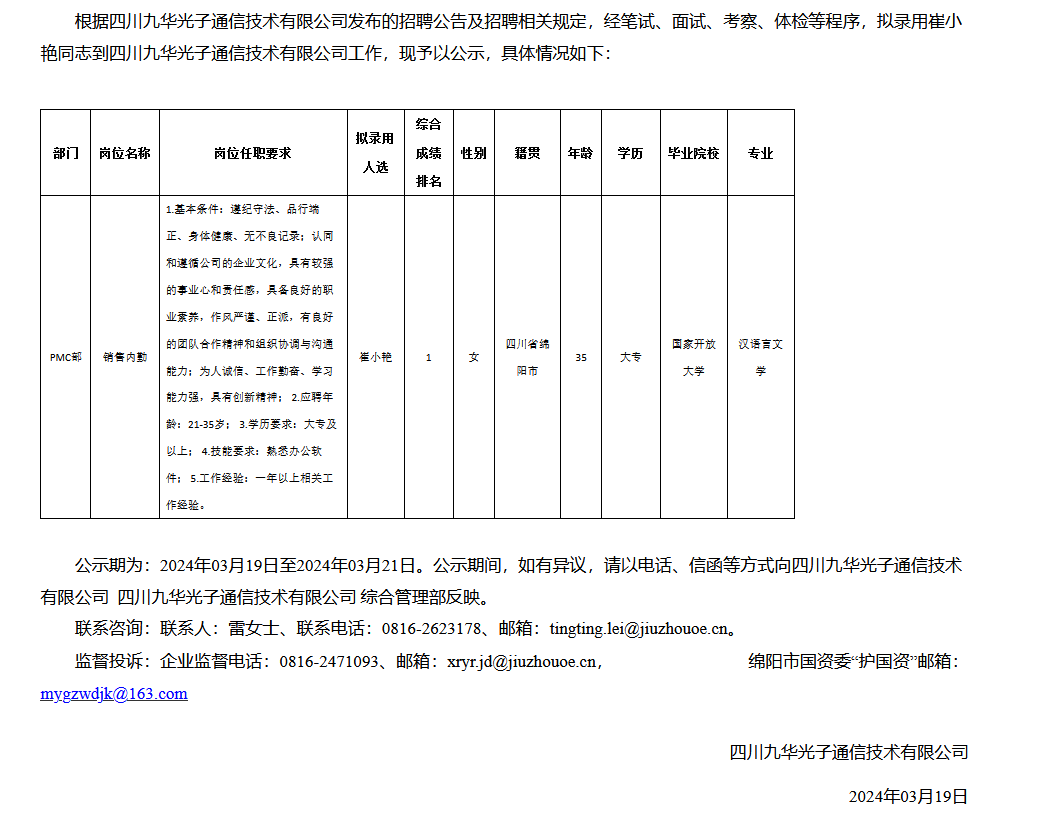 四川九華光子通信技術(shù)有限公司關(guān)于招聘銷售內(nèi)勤擬錄用人員的公示