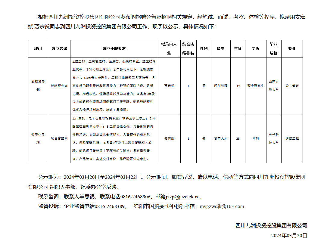 四川九洲投資控股集團(tuán)有限公司關(guān)于招聘項目管理等崗位擬錄用人員的公示