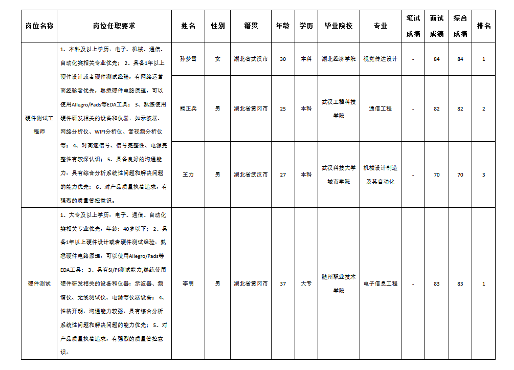 根據(jù)四川九州電子科技股份有限公司發(fā)布的招聘公告及招聘相關規(guī)定,經(jīng)筆試、面試等程序,現(xiàn)將筆試(面試)成績予以公示。
