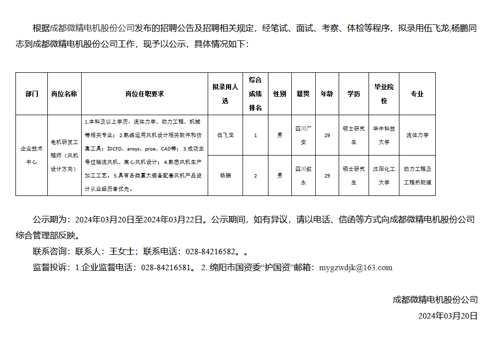成都微精電機(jī)股份公司關(guān)于招聘電機(jī)研發(fā)工程師(風(fēng)機(jī)設(shè)計(jì)方向)崗擬錄用人員的公示