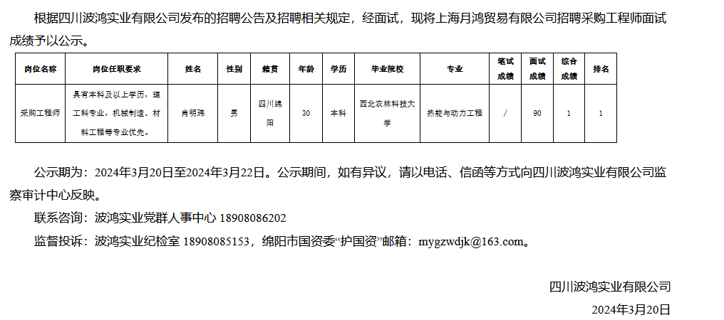 四川波鴻實(shí)業(yè)有限公司關(guān)于招聘上海月鴻貿(mào)易有限公司采購(gòu)工程師成績(jī)的公示