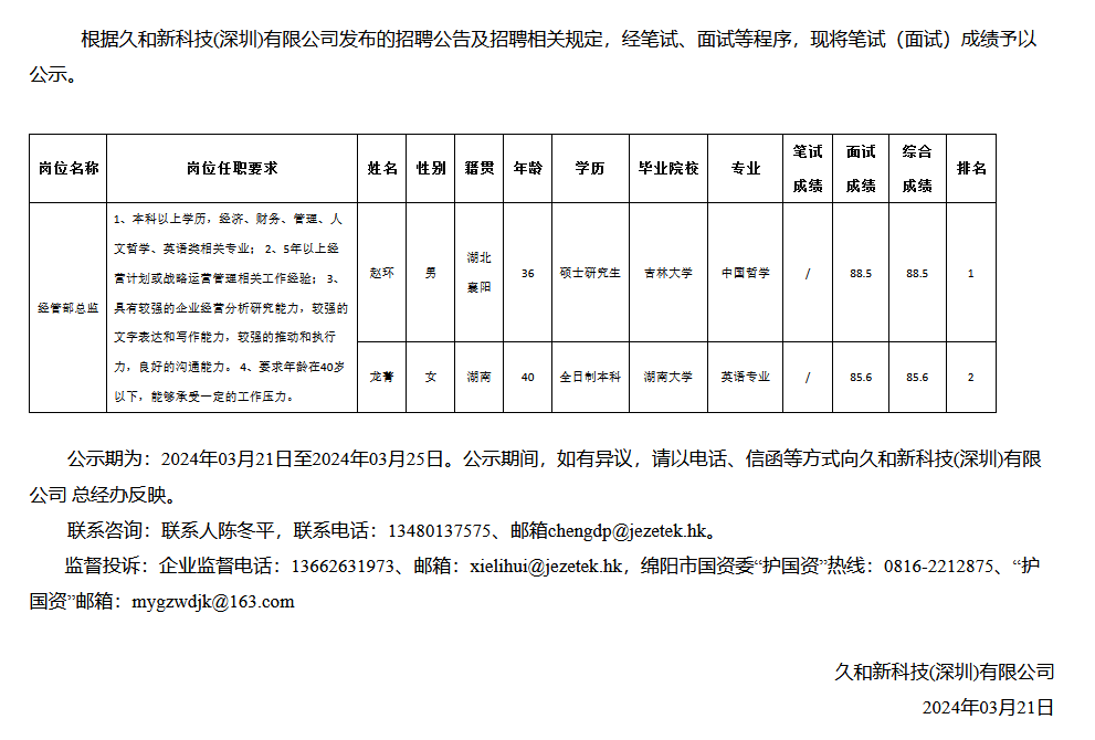 久和新科技(深圳)有限公司關于招聘經(jīng)管部總監(jiān)成績的公示