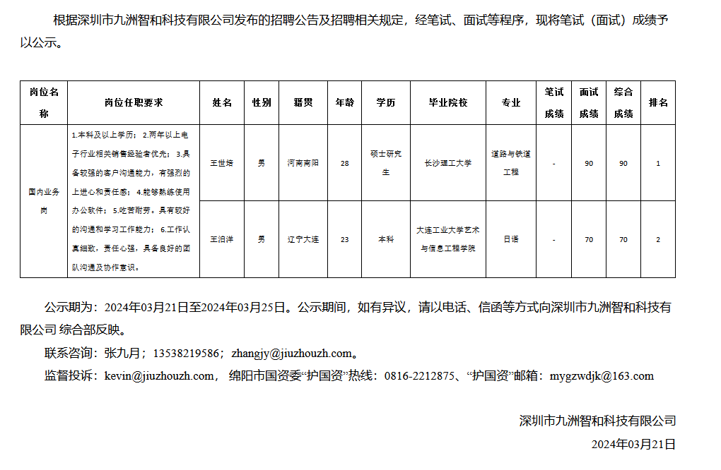 深圳市九洲智和科技有限公司關(guān)于招聘國(guó)內(nèi)業(yè)務(wù)崗成績(jī)的公示