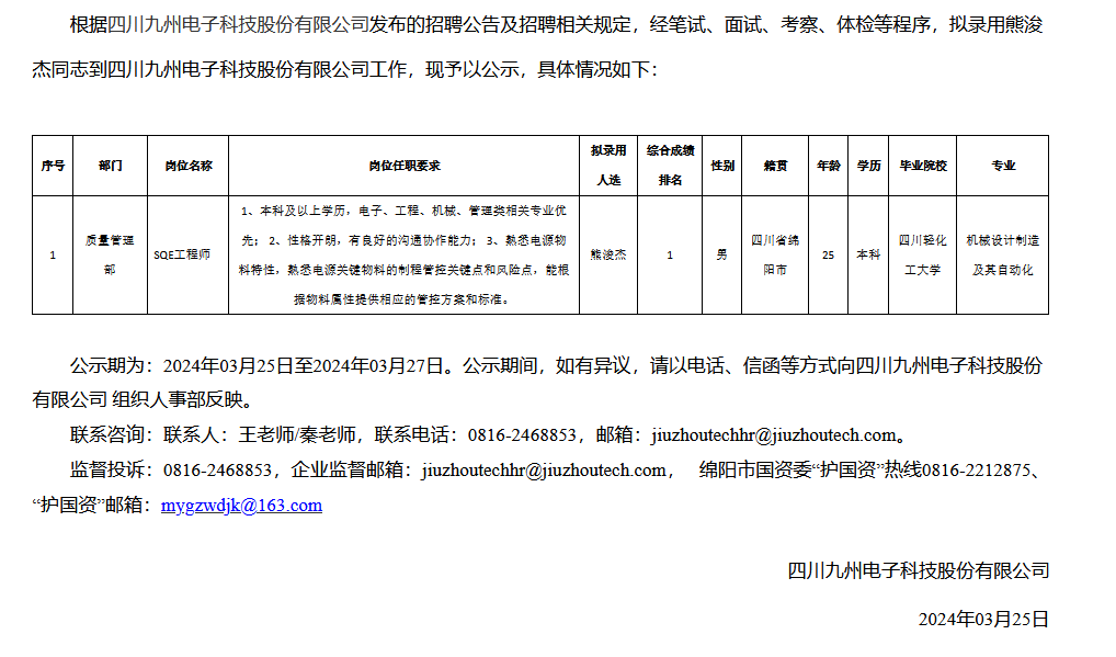 四川九州電子科技股份有限公司關(guān)于招聘SQE工程師崗位擬錄用人員的公示