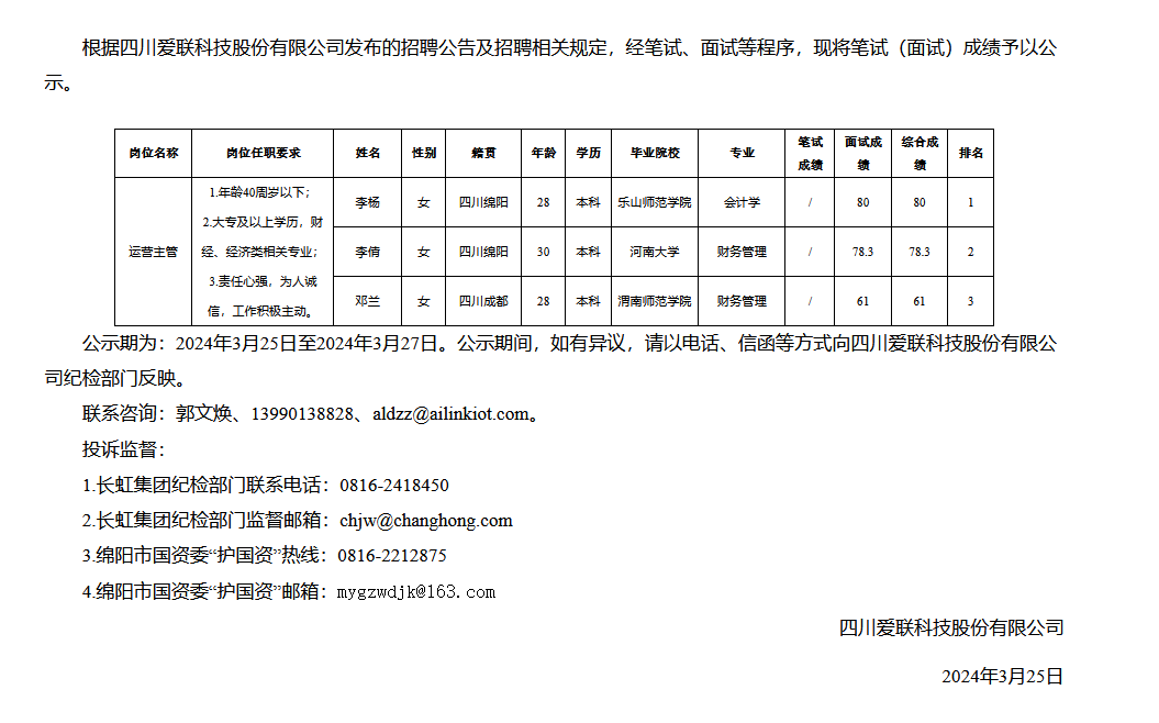 四川愛(ài)聯(lián)科技股份有限公司關(guān)于招聘運(yùn)營(yíng)主管成績(jī)的公示
