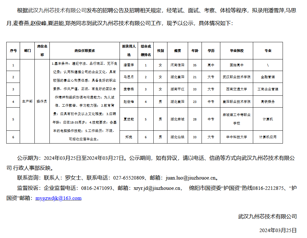 武漢九州芯技術(shù)有限公司關(guān)于招聘操作員擬錄用人員的公示