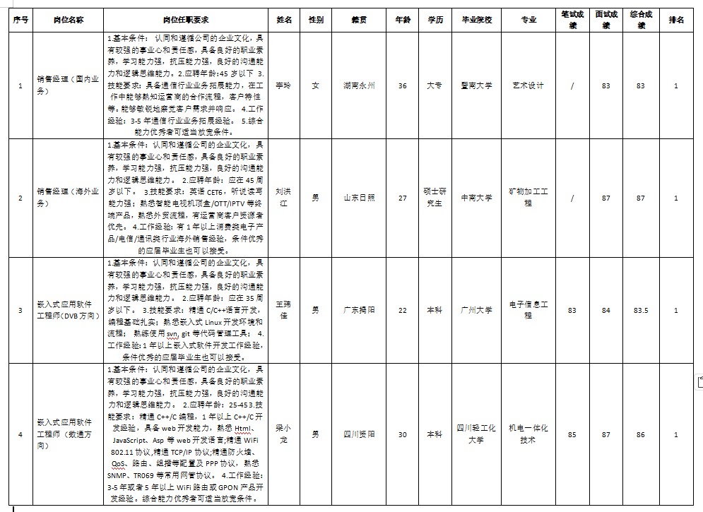 根據(jù)深圳市九州電器有限公司發(fā)布的招聘公告及招聘相關規(guī)定,經(jīng)筆試、面試等程序,現(xiàn)將筆試(面試)成績予以公示。