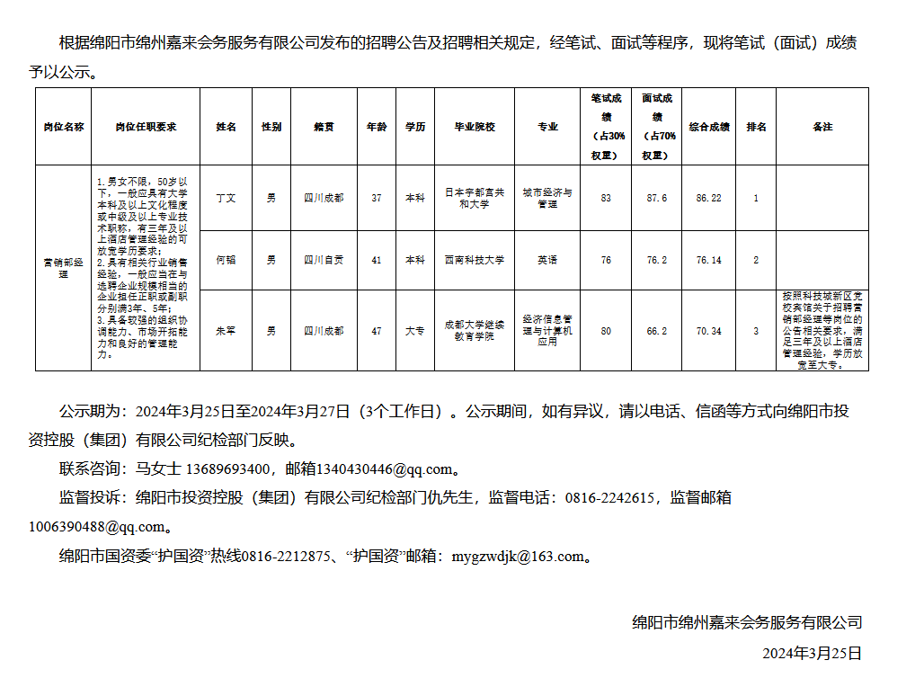 科技城新區(qū)黨校賓館關(guān)于招聘營(yíng)銷部經(jīng)理成績(jī)的公示