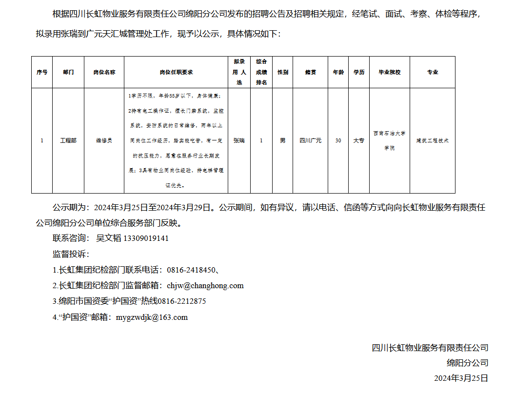 四川長虹物業(yè)服務(wù)有限責(zé)任公司綿陽分公司關(guān)于招聘維修員擬錄用人員的公示