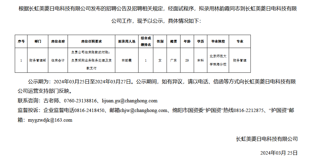 長虹美菱日電科技有限公司關(guān)于招聘往來會(huì)計(jì)擬錄用人員的公示