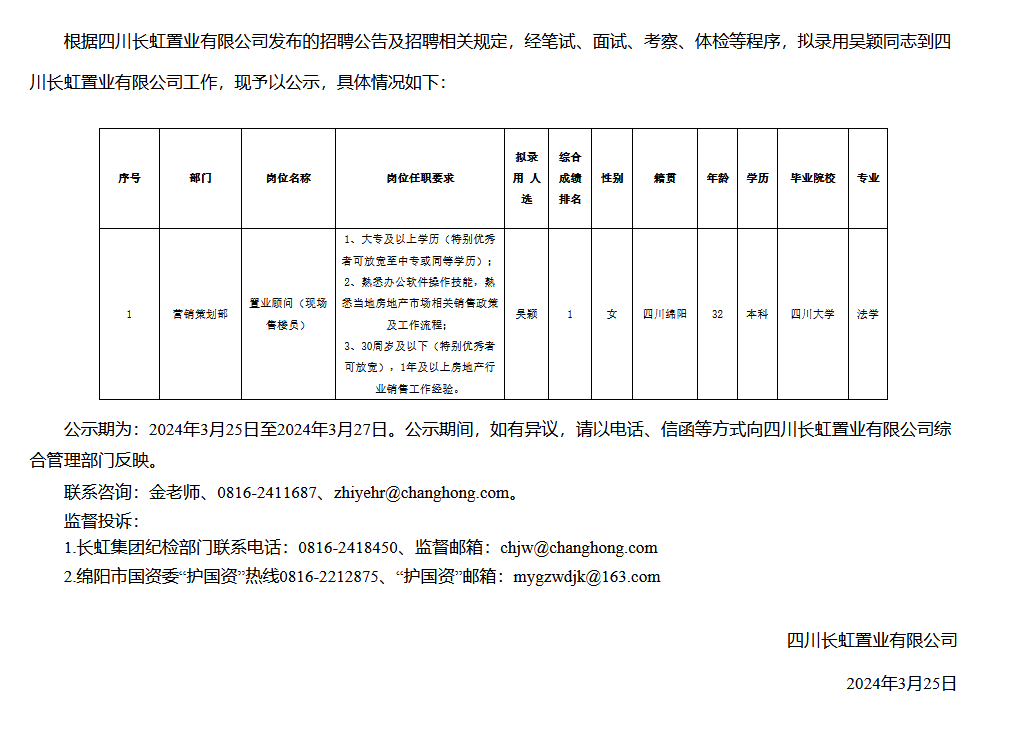 四川長虹置業(yè)有限公司關(guān)于招聘置業(yè)顧問(現(xiàn)場售樓員)擬錄用人員的公示