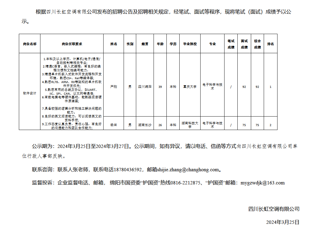 四川長虹空調(diào)有限公司關(guān)于招聘軟件設(shè)計崗位擬錄用人員的公示