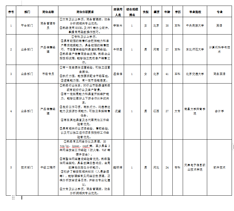 根據(jù)四川長虹佳華信息產(chǎn)品有限責(zé)任公司發(fā)布的招聘公告及招聘相關(guān)規(guī)定,經(jīng)面試、考察、體檢等程序,擬錄用李培興、牛明圓、溫佳佳、況望、魏明輝同志到四川長虹佳華信息產(chǎn)品有限責(zé)任公司工作,現(xiàn)予以公示,具體情況如下: