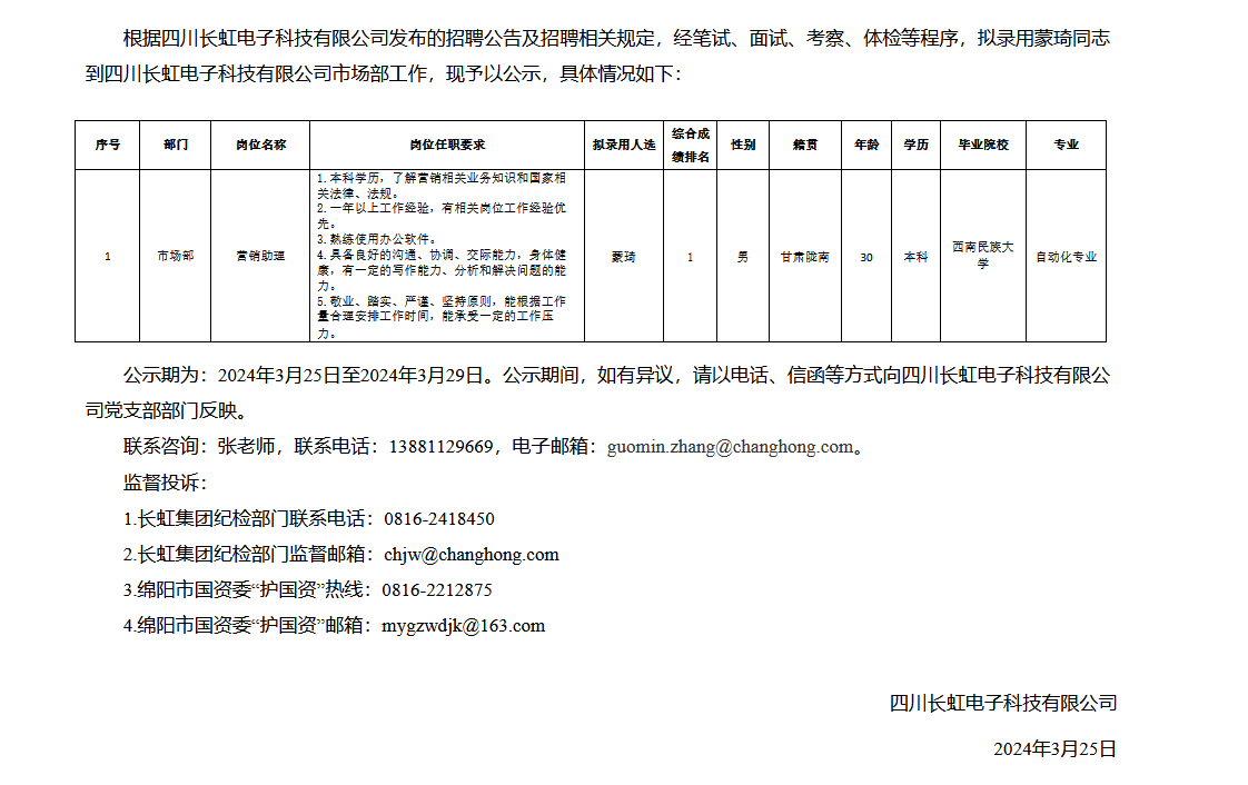 四川長(zhǎng)虹電子科技有限公司關(guān)于招聘營(yíng)銷(xiāo)助理擬錄用人員的公示
