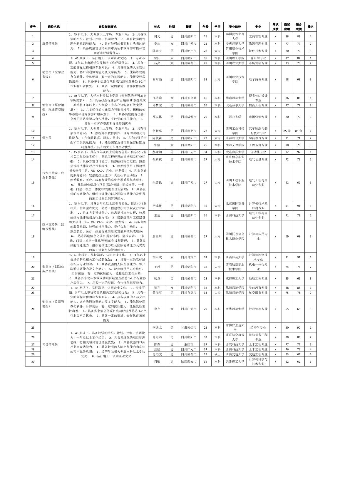 根據(jù)四川九州北斗導(dǎo)航與位置服務(wù)有限公司發(fā)布的招聘公告及招聘相關(guān)規(guī)定,經(jīng)筆試、面試等程序,現(xiàn)將筆試(面試)成績(jī)予以公示。