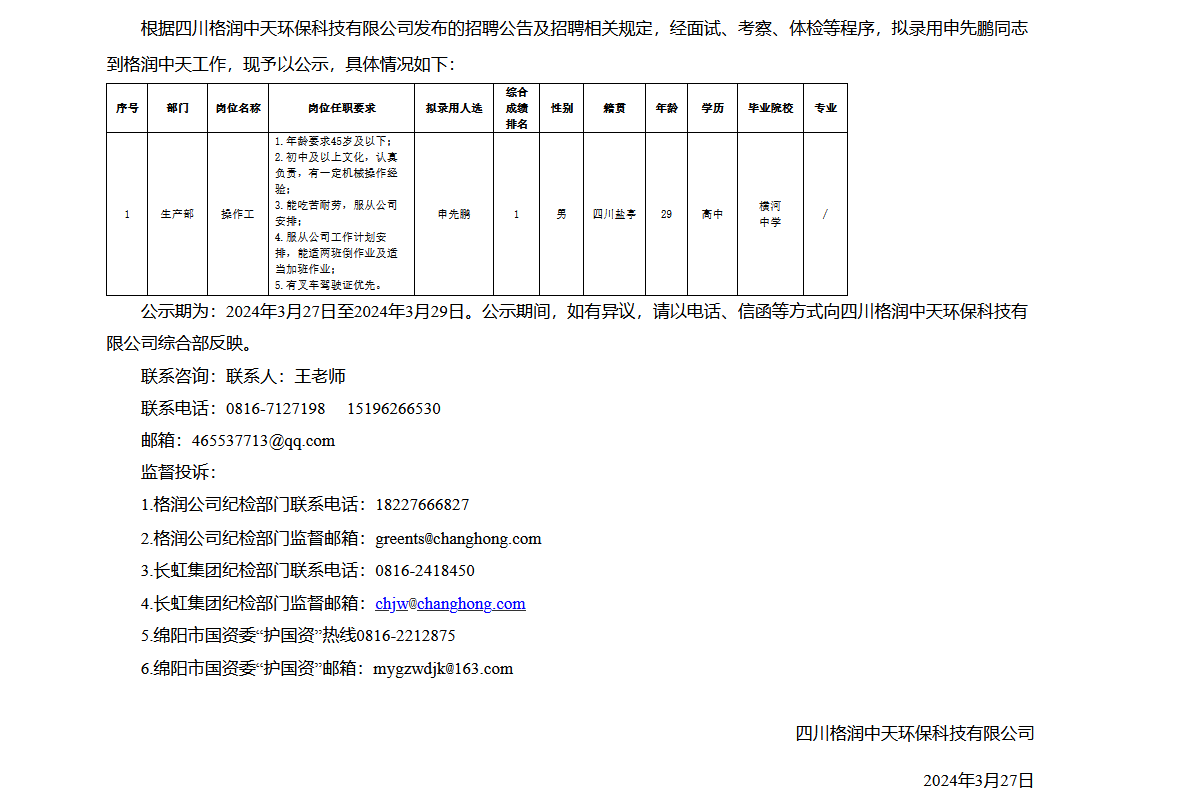 四川格潤中天環(huán)??萍加邢薰娟P(guān)于招聘操作工擬錄用人員的公示