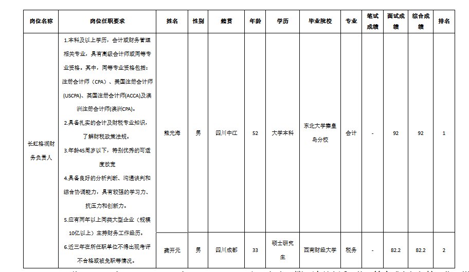 根據(jù)長虹控股集團(tuán)發(fā)布的招聘公告及招聘相關(guān)規(guī)定,經(jīng)面試程序,現(xiàn)將成績予以公示。其中,因熊光海較為熟悉長虹產(chǎn)業(yè),與崗位匹配度較高,屬于較為合適人選,根據(jù)崗位任職要求第3點(diǎn),適度放寬年齡,進(jìn)入面試環(huán)節(jié)。