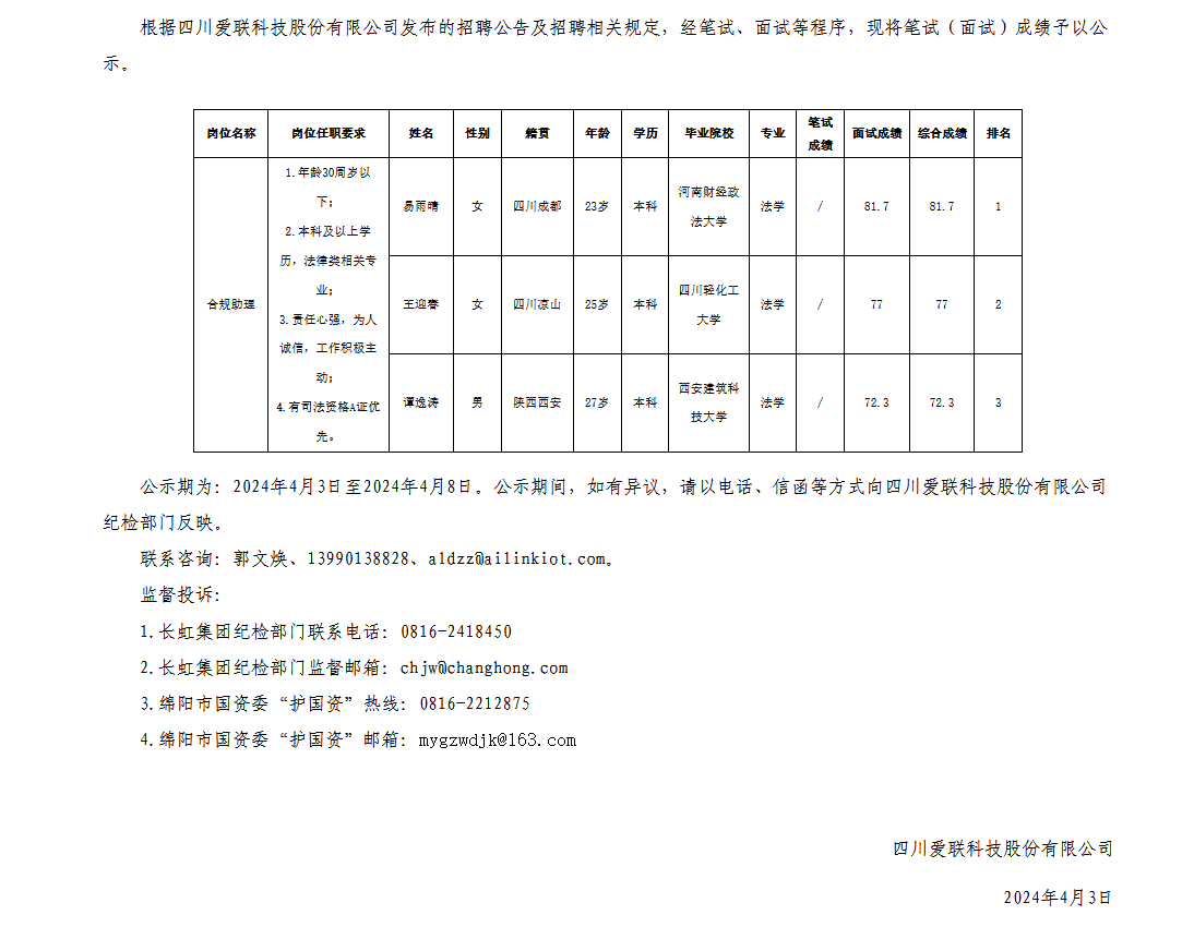 四川愛聯(lián)科技股份有限公司關(guān)于招聘合規(guī)助理崗位測試成績的公示