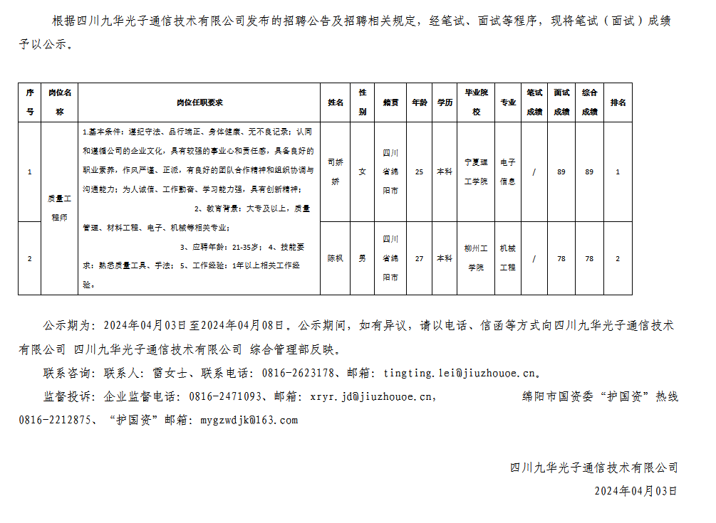四川九華光子通信技術(shù)有限公司關(guān)于招聘質(zhì)量工程師測試成績的公示