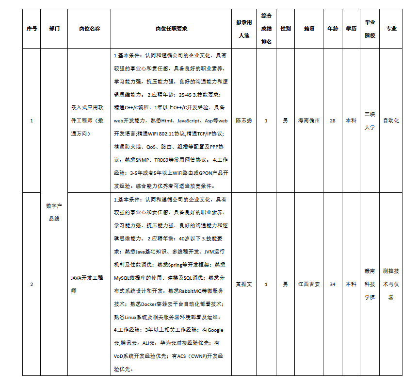 根據(jù)深圳市九州電器有限公司發(fā)布的招聘公告及招聘相關(guān)規(guī)定,經(jīng)筆試、面試、考察、體檢等程序,擬錄用陳志揚,黃振文同志到深圳市九州電器有限公司工作,現(xiàn)予以公示,具體情況如下: