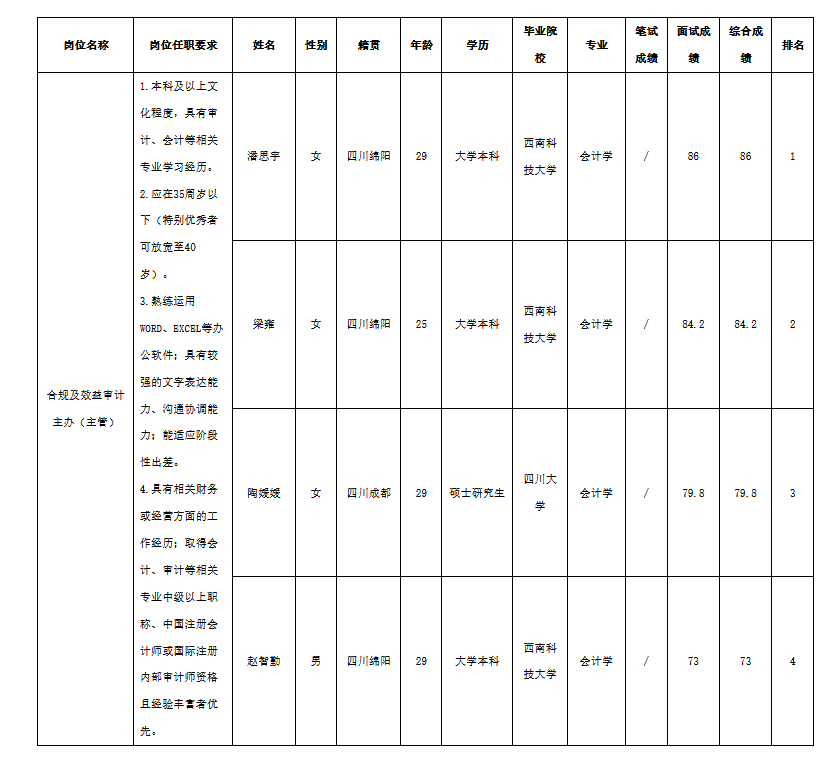 根據(jù)四川長虹置業(yè)有限公司3月6日發(fā)布的招聘公告及招聘相關(guān)規(guī)定,經(jīng)初試、復(fù)試等程序,現(xiàn)將面試成績予以公示。