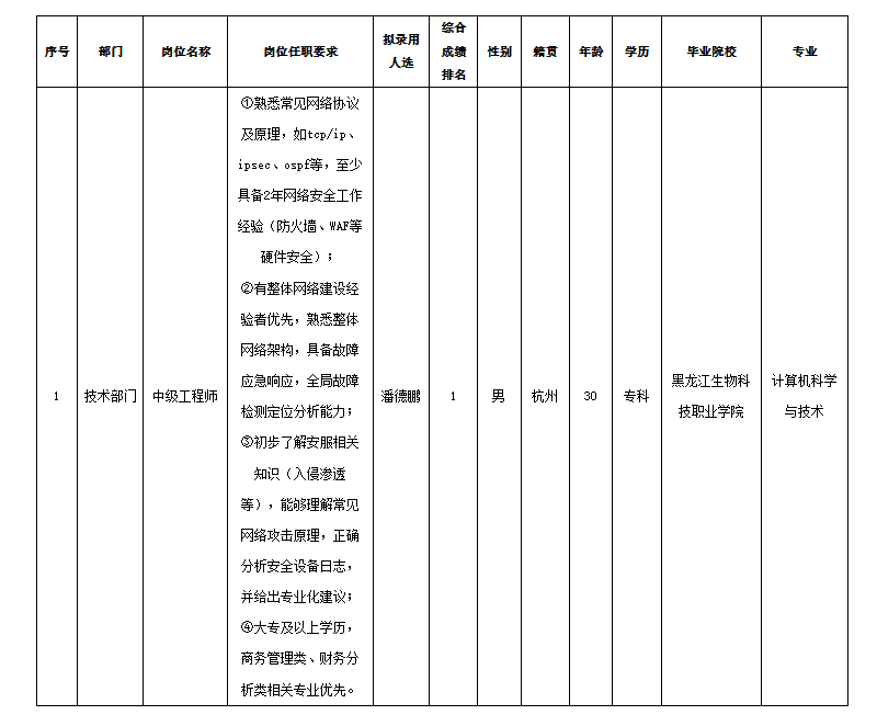 根據(jù)四川長虹佳華信息產(chǎn)品有限責(zé)任公司發(fā)布的招聘公告及招聘相關(guān)規(guī)定,經(jīng)面試、考察、體檢等程序,擬錄用潘德鵬同志到四川長虹佳華信息產(chǎn)品有限責(zé)任公司工作,現(xiàn)予以公示,具體情況如下: