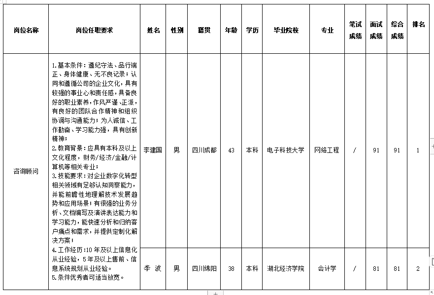 根據(jù)四川虹信軟件股份有限公司發(fā)布的招聘公告及招聘相關(guān)規(guī)定,經(jīng)筆試、面試等程序,現(xiàn)將筆試(面試)成績(jī)予以公示。