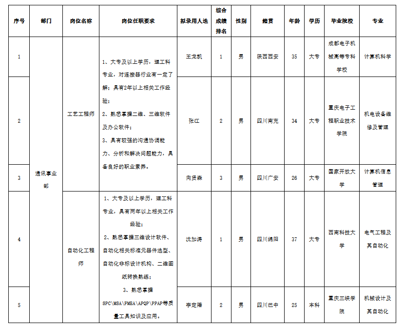根據(jù)四川華豐科技股份有限公司發(fā)布的招聘公告及招聘相關(guān)規(guī)定,經(jīng)筆試、面試、考察、體檢等程序,擬錄用王龍凱同志到四川華豐科技股份有限公司工作,現(xiàn)予以公示,具體情況如下: