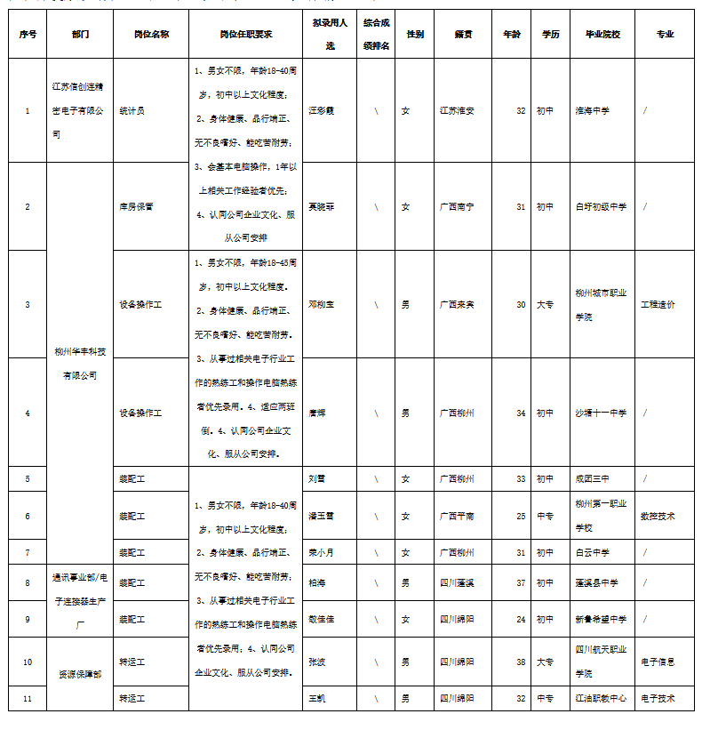 根據四川華豐科技股份有限公司發(fā)布的招聘公告及招聘相關規(guī)定,經面試、考察、體檢等程序,擬錄用以下11人到四川華豐科技股份有限公司工作,現(xiàn)予以公示,具體情況如下: