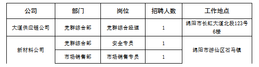 四川大道致遠供應(yīng)鏈管理有限責(zé)任公司(以下簡稱大道供應(yīng)鏈公司)是綿陽交通發(fā)展集團有限責(zé)任公司旗下全資子公司,成立于2021年1月,注冊資本2900萬元,業(yè)務(wù)范圍覆蓋建筑用鋼筋產(chǎn)品銷售、水泥銷售、石油制品銷售等。綿陽交發(fā)大道新材料科技有限責(zé)任公司(以下簡稱新材料公司)是大道供應(yīng)鏈公司旗下全資子公司,成立于2021年11月,主營業(yè)務(wù)為廢舊瀝青再生技術(shù)研發(fā)與瀝青砼生產(chǎn)貿(mào)易。現(xiàn)因公司經(jīng)營發(fā)展需要,經(jīng)研究決定面向社會公開招聘,具體招聘情況如下: