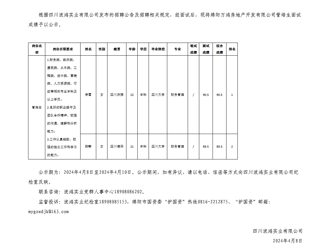 四川波鴻實(shí)業(yè)有限公司關(guān)于招聘綿陽(yáng)萬(wàn)鴻房地產(chǎn)開(kāi)發(fā)有限公司管培生測(cè)試成績(jī)的公示